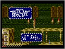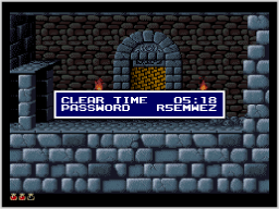 | 最後のLEVELをクリアする前に残り時間が0になってしまうと、城の最上階に辿り着いても、姫を助け出すことができません。パスワードを入力して途中から始めた場合、前のLEVELをクリアしたときの残り時間で再開できます。 | ![]() |