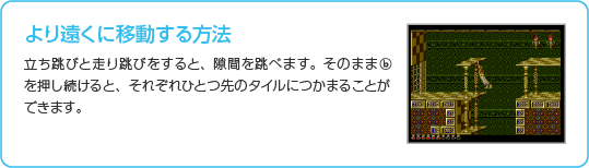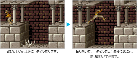 2タイルで走り跳びをするアクションです。助走できる足場がないところで走り跳びができます。跳びたい方と逆の ![]() |