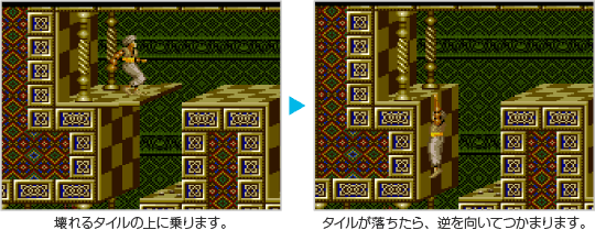自分は落ちずにタイルだけ落とすアクションです。タイルを落として重りにして、スイッチを作動させたいときに利用できます。壊れるタイルの上に乗って、タイルが落ちる瞬間に ![]() |