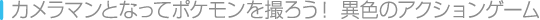 | 『ポケモンスナップ』は1999年3月21日に発売された、「ポケットモンスター」シリーズの外伝作品です。 主人公は「ポケモントレーナー」ではなく、「ポケモンカメラマン」。「ポケモンアイランド」に住むポケモンたちの姿をカメラに収めていくのが、このゲームの目的です。バトルしたり、つかまえたりはしませんが、ポケモンたちの魅力がギッシリつまった、ファンにはたまらない一作です。 |