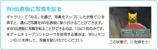 これまでに保存した写真のなかから、お気に入りを4枚選んで並べておくことができます。「ポケモンレポート」か「ポケモンアルバム」を選び、並べたい写真を決めましょう。「いれかえ」で4枚の写真の位置を入れ替えることができます。 また、「みる」を選ぶとお気に入りの写真を大きくして見ることができます。メッセージを消したいときは |