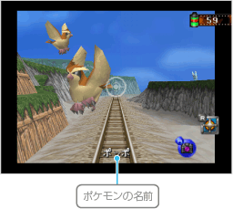 を押すとシャッターをきり、写真を撮ります。写真を撮ると、画面にポケモンの名前が表示されます。このとき、初めて撮影したポケモンには「NEW」と表示されます。また、名前の代わりに「?」と表示されているポケモンは、今の時点では何のポケモンかわかりません。