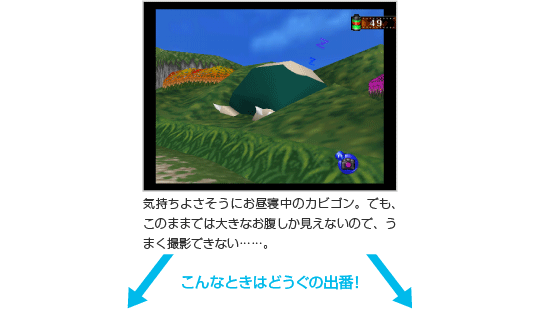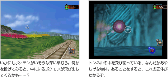 目に見えるポケモンをただ撮っているだけでは、『ポケモンスナップ』の世界を楽しみつくすことはできません。コース内には、一目見たたけではわからないほどたくさんのポケモンが隠れています。何度もコースを回って、ぜひすべてのポケモンをカメラに収めてください。 ![]() |