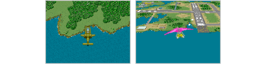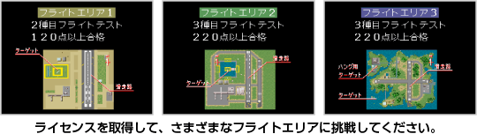 『パイロットウイングス』はいくつかのフライトエリアで構成されており、各フライトエリアでは複数のスカイスポーツに挑戦(フライトテスト)することができます。フライトエリアは初心者向けのものから上級者向けのものまでさまざまな種類がありますが、最初は初心者向けのカンタンな種目で操作方法やフライトのコツを学ぶことができます。さらに、フライトエリアをクリアしてライセンスを取得すると、難易度の高い種目に挑戦することも可能です。 ![]() |
