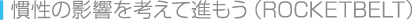 | ROCKETBELTは、慣性の影響を強く受けます。そのため、前進から右へ方向転換しようとすると、直前の進行方向(前進)に引っぱられ、真横ではなく斜め前に進むことになります。これは、上昇・下降するときも同様です。直前の移動での力を利用しながら進む方向を調節してください。 | ![]() |