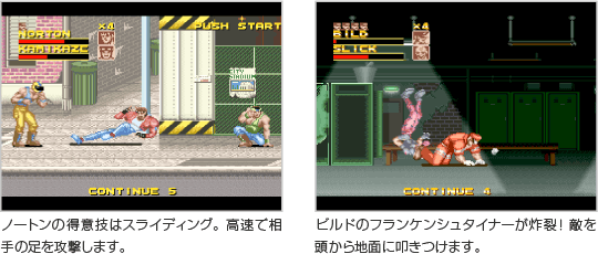操作できるキャラクターは、誘拐されたマリアの兄「リック・ノートン」と、ノートンとマリアを幼いころから知るノートンの先輩「ダグラス・ビルド」の2人です。ノートンは軽い身のこなしを活かして戦い、ビルドはパワーを活かして戦います。 ![]() |