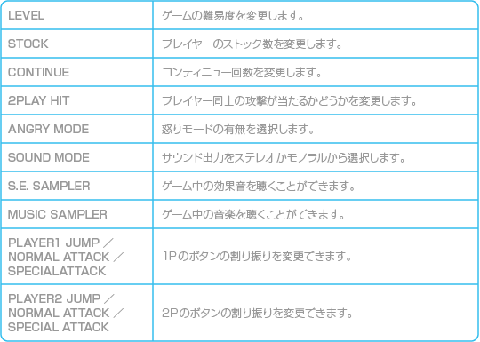 2人プレイ専用の対戦モードです。2ラウンド先取した側の勝利となります。 |
