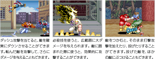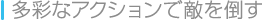 5人のキャラクターは、連続攻撃や必殺技、組み技など、多彩な攻撃を放つことができます。これらの攻撃を状況に合わせて使いわけると、敵を倒しやすくなります。 ![]() |