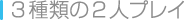 2人プレイには、通常のモードを2人で協力してプレイするものと、2種類の対戦プレイがあります。 ![]() |