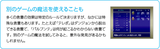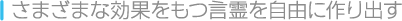 このゲームでは、「言霊」と呼ばれる魔法を使用できます。言霊はプレイヤーが自由に文字を入力して作り、入力した文字によって効果が決まります。効果は一定のルールによって決まり、ルールを把握することで目的に合った言霊を作ることもできます。 |