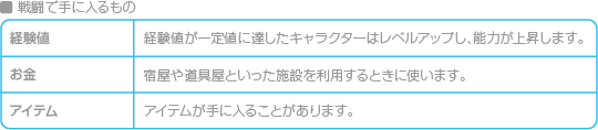 主人公たちは戦闘に勝つと、経験値(EXP)やお金(ラグ)、アイテムを手に入れます。