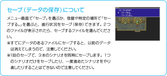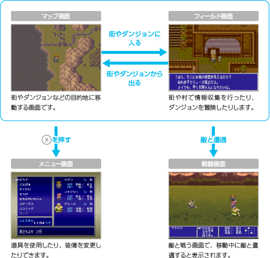 マップ画面やフィールド画面で移動し、戦闘画面で敵と戦ってゲームを進めます。メニュー画面を表示すると、さまざまな情報を確認できます。 ![]() |