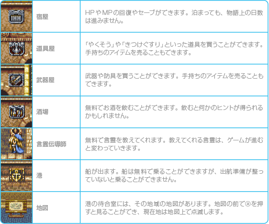 街や村には、さまざまなショップがあります。ショップではアイテムの売買や情報収集などができます。下記では代表的なショップを紹介します。 |