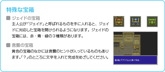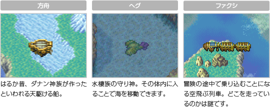 ゲーム中にはボートや定期船といった乗物が登場し、特定の場所まで主人公たちを運んでくれます。一部の乗物は 下記では代表的な乗物を紹介します。 |