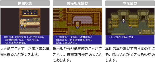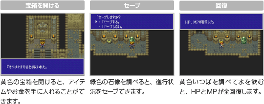人々から話を聞いて情報を得たり、さまざまな施設で買い物や休息をしたりできます。ダンジョンでは敵が出現することがあります。 |