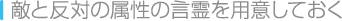| 敵の属性と反対の属性で攻撃すると、大きなダメージを与えることができます。登場する敵の属性がわかっている場合は、反対の属性の言霊を準備しておくことをオススメします。 | ![]() |