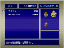 アイテムは9個まで持つことができます。「やくそう」や「おいしいみず」といった道具は街で購入できるので、ダンジョンなどに行くときには、多めに用意しておくと探索に役立ちます。 |