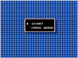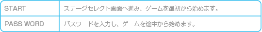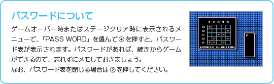 メニュー画面で「PASS WORD」を選ぶとパスワード入力画面になります。各ステージクリア後に表示されるパスワードを正しく入力すると、入手した武器やアイテムを持った状態でゲームを再開できます。パスワードを入力するには、 ※パスワードで再開した場合、ロックマンの残り数やエネルギーゲージ、武器エネルギーゲージは初期の状態になります。 |
