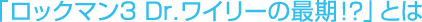 | 『ロックマン3 Dr.ワイリーの最期!?』は、人型のロボット「ロックマン」を操作してステージクリアをめざすアクションゲームです。1987年に発売された『ロックマン』、1988年に発売された『ロックマン2 Dr.ワイリーの謎』の続編として、1990年9月28日に発売されました。 状況に合わせて武器を切り替えたり、新たに加わった仲間「ラッシュ」の力を借りて、ステージを進んで行きましょう。 |