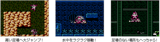 ラッシュを呼び出せば、3種類の機能を使ってロックマンの手助けをしてくれます。 進めそうにない場所でも、ラッシュの助けを借りればきっと乗り越えられるでしょう。 ![]() |