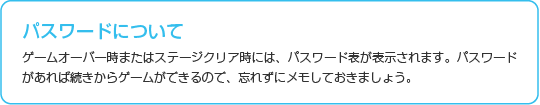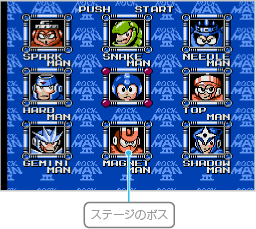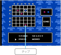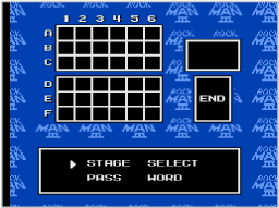 ゲームオーバー時やステージクリア時に表示されるパスワードを入力して、続きからプレイします。 パスワード入力を始める場合は、もう一度「PASS WORD」を選んでください。「STAGE SELECT」を選ぶと、パスワード入力を中止してステージセレクト画面に進みます。 ※パスワードで再開した場合、ロックマンの残り数やエネルギーゲージ、武器エネルギーゲージは初期の状態に戻ります。 |