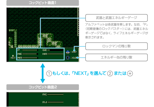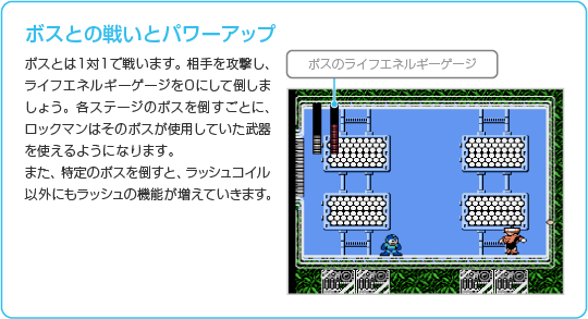 武器エネルギーゲージは武器やラッシュの機能ごとに設定され、それぞれを使うと消費します。アイテムの「武器エネルギー」を取って、ゲージを補充しながら先をめざしてください。 なお、初期装備の武器(ロックバスター)は補充不要で、武器エネルギーゲージは表示されません。 |