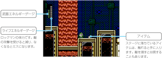 敵の攻撃を受けるとダメージを受け、ライフエネルギーゲージが減ります。「ライフエネルギーゲージがなくなる」「針など特定のトラップに当たる」「穴に落ちる」とミスになり、ロックマンの残り数が1つ減ります。 |