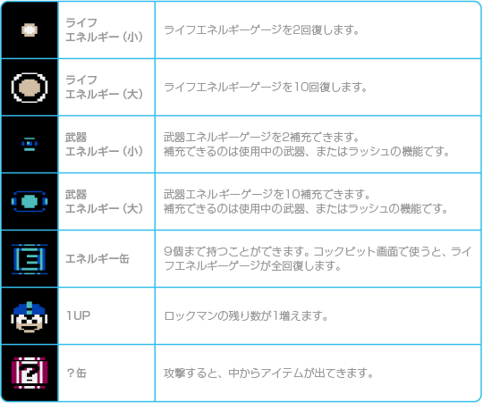 アイテムにはステージ中にあるものと、敵を倒すと出現するものがあります。