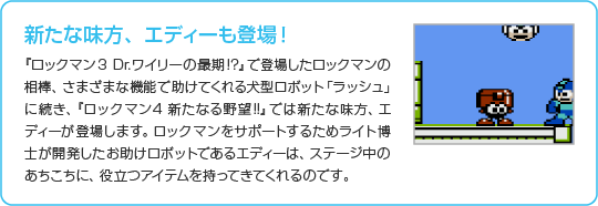 | 1987年に発売された『ロックマン』に始まり、『ロックマン2 Dr.ワイリーの謎』、『ロックマン3 Dr.ワイリーの最期!?』と続いてきたファミリーコンピュータのアクションゲーム「ロックマン」シリーズ。これらに続いて1991年12月6日に発売されたのが『ロックマン4 新たなる野望!!』です。 シリーズを通して活躍する主人公「ロックマン」が、今度は新たな敵「Dr.コサック」に立ち向かいます。 |