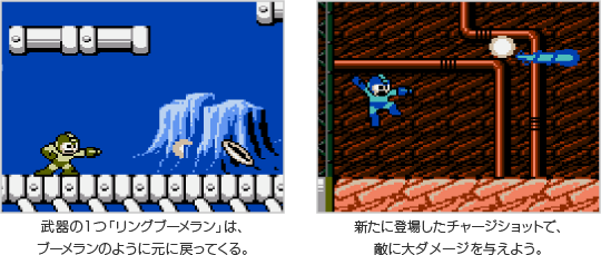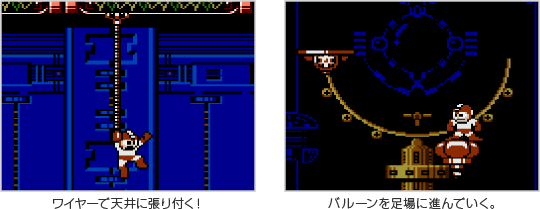 ステージの途中で手に入る「ワイヤー」と「バルーン」は、ロックマンが移動するときに便利な武器。相棒「ラッシュ」の各機能と同じく、さまざまな局面で役に立ちます。これらをうまく使いこなせるかが、ステージ攻略のカギを握ります。 ![]() |
