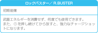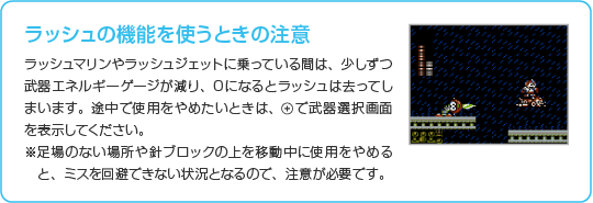ロックマンはさまざまな武器を使ったり、ラッシュの機能を利用できます。 武器(ラッシュの機能)の切り替えは、武器選択画面で行ってください。 |