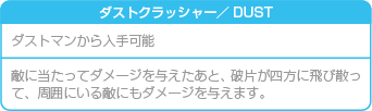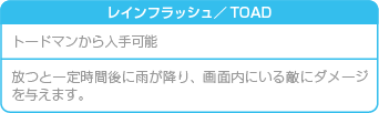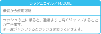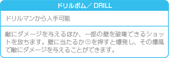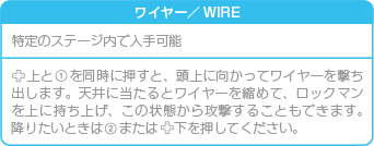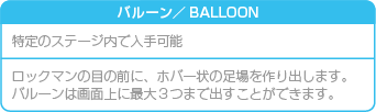 「ワイヤー」と「バルーン」は特殊な武器で、特定のステージでアイテムを拾うと使用可能になります。 これらは攻撃のための武器ではなく、移動のときに重要な役割を果たします。 |