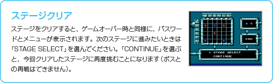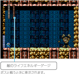 「ロックマン」を操作して、さまざまな武器や、相棒である犬型ロボット「ラッシュ」の機能を利用しながらステージを進んでください。最後に待つボスを倒すとステージクリアとなり、ステージセレクト画面に戻ります。8つのステージは自由な順番で挑戦でき、すべてクリアすると新しいステージに進めるようになります。 ![]() |