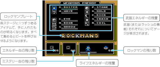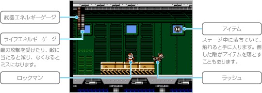 各ステージのボスを倒すと、ロックマンはそのボスが使用していた武器を使えるようになります。また、特定のボスを倒すと、ラッシュの機能が追加されます。 |