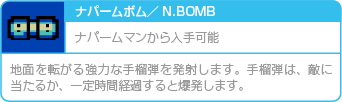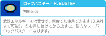 ロックマンは最初はロックバスターのみ使用できます。各ステージにいるボスを倒すと、そのボスが使っていた特殊武器を入手できます。