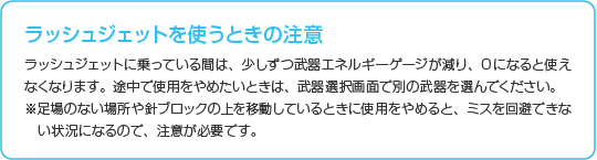 ロックマンはさまざまな武器を使ったり、ラッシュの機能を利用したりできます。武器またはラッシュの機能の切り替えは、武器選択画面で行ってください。