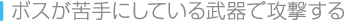 | ボスたちはそれぞれ特定の武器を苦手としています。さまざまな武器を試して、苦手なものを探してみてください。また、相手の苦手な武器で戦えるよう、ステージをどの順番でクリアしていくかを考えるのも重要です。 | ![]() |
