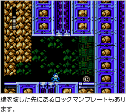 | 各ステージにあるロックマンプレートを手に入れると、ビートを呼び出せるようになります。ビートは強力な武器で、ロックバスターと同時に使うことができます。取り逃してステージをクリアした場合は、同じステージをもう一度プレイして探してみてください。 | ![]() |