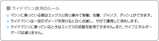 敵が乗っていないライドマシンにエックスが触れると、搭乗することができます。マシンから降りるときは |