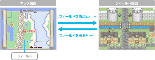 このゲームには、「マップ画面」「フィールド画面」「メニュー画面」「戦闘画面」の4つの画面があります。