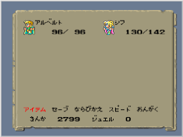 を押すと、メニュー画面になります。メニュー画面では、装備をととのえたり、アイテムや術法を使ってH Pを回復することなどができます。ここで冒険の準備をしておいてください。