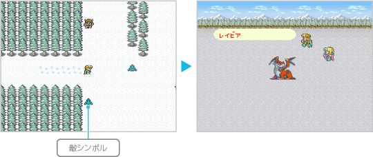 フィールド画面で敵シンボルに触れると、戦闘画面になります。キャラクターに攻撃などの指示を出して戦ってください。勝利するとお金をもらうことができ、キャラクターが成長することもあります。
