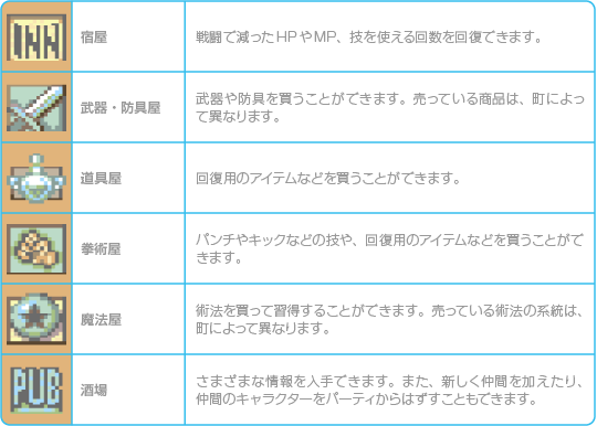 町には「宿屋」や「武器・防具屋」などの施設があります。 ![]() |