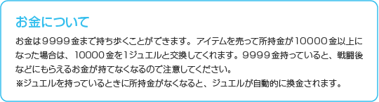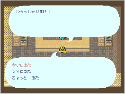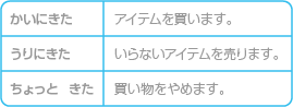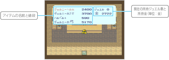 「武器・防具屋」「道具屋」「拳術屋」では、店主に話しかけると3つのメニューが表示されます。 ![]() |