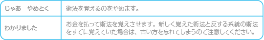 「魔法屋」では、キャラクターにさまざまな術法を覚えさせることができます。 |