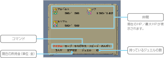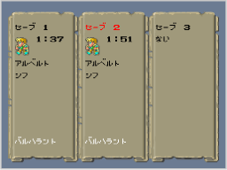 現在の進行状況を保存(セーブ)できます。3つのファイルのなかから、セーブするファイルを選んでください。 |