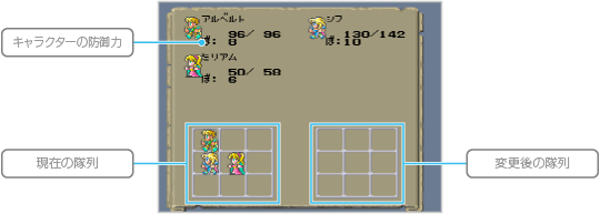 戦闘時の隊列を変更できます。タテ3列、ヨコ3列の合計9マスに、キャラクターを選んで配置してください。なお、戦闘開始時に敵シンボルと触れた方向によって、隊列が変化します。 ![]() |