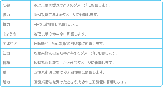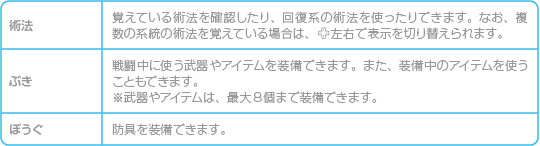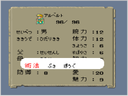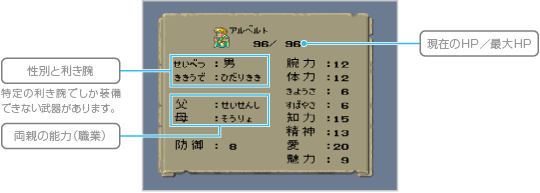 メニュー画面で仲間を選ぶと、選んだ仲間のステータスを確認できます。