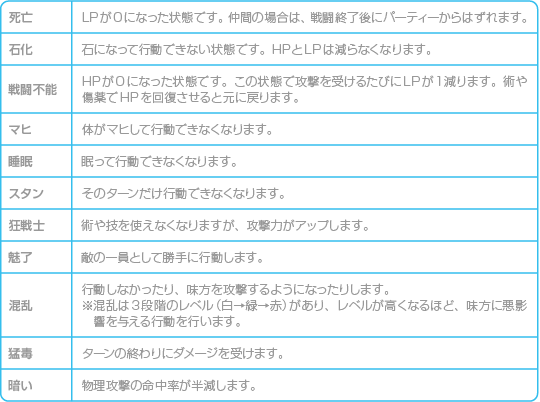 特殊な攻撃を受けると、以下の状態異常になることがあります。術や傷薬などで回復してください。なお、「死亡」以外の状態異常は、戦闘終了後に回復します。 |