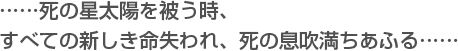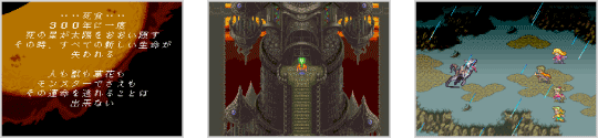 ![]() 600年前、死食(死星による太陽の食)が起こったとき、 すべての新しい命が失われた。 人も動物も植物もモンスターも一様に災厄に見舞われた。 だが、ただ一人の赤ん坊だけが生き延びた。 死に魅入られ、死を背負ったその子は、長じて魔王になり、世界に君臨した。 魔王の支配による荒廃から世界がようやく立ち直ろうとしていた頃、 300年前、またもや死食が世界を襲った。 再びただ一人の赤ん坊が生き残った。 魔王の記憶はよみがえり、人々は赤ん坊を殺そうとした。 しかし、宿命はその子の命を終わらせはしなかった。 死の息吹に耐え、死を跳ね返したその子は、 長じて聖王となり、世界を安定させた。 聖王の作り上げた世界の秩序が乱れ始めた頃、 今この時代、三度死食は世界を被い、 またも一人の赤ん坊をこの世に残した。 宿命によりその子は成長していた。 どのような宿命がその子に、そして世界に与えられたのか? ![]() ![]() |